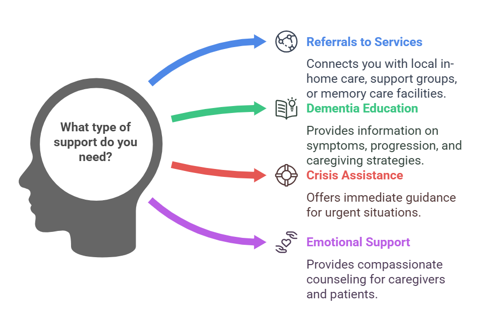 - Referrals to local programs and services – Need in-home care, a support group, or a memory care facility? The helpline connects you with trusted resources in your area.